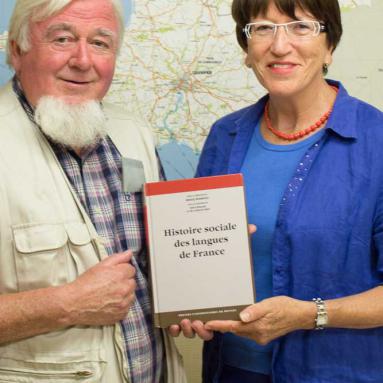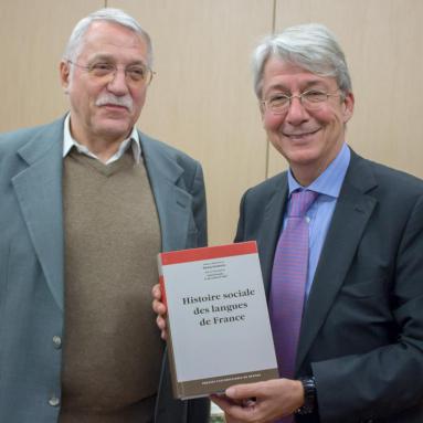 Il s'exprimait en ces termes le 5 février 2014 en recevant les membres du collectif qui vient de faire paraître aux Presses universitaires de Rennes un ouvrage de référence consacré à l'Histoire sociale des langues de France. G. Kremnitz, le directeur de l'ouvrage, n'a pas manqué de souligner lui aussi que "le facteur temps joue" : si des langues comme l'arabe maghrébin se portent très bien, il en est d'autres qui vont très mal. Comme il s'intéresse à l'occitan depuis un demi-siècle, il a lui aussi vu et vécu le changement du paysage langagier qui s'est produit en France et qui, à ses yeux, représente "une perte" : pour l'homme comme pour la société, le plurilinguisme constitue une richesse.